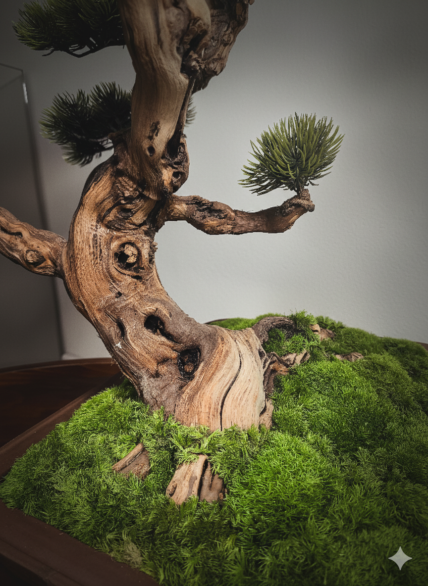 Das stabilisierte Moos bildet eine lebendige, sattgrüne Basis und bettet den Baum in eine ruhige Miniaturlandschaft ein.
