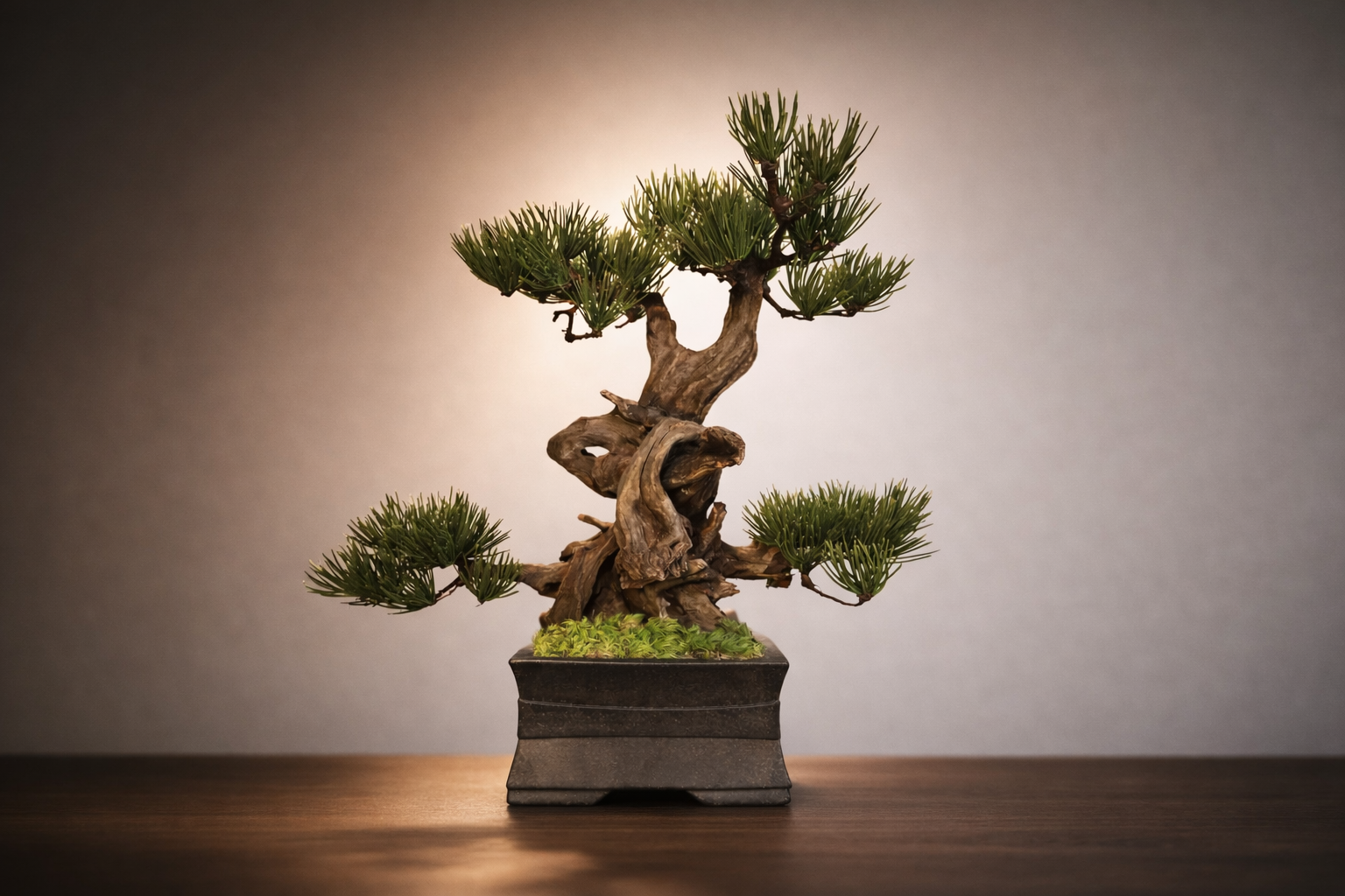 In seiner kompakten Präsenz fügt sich dieser Bonsai harmonisch in moderne Wohn- und Arbeitsräume ein