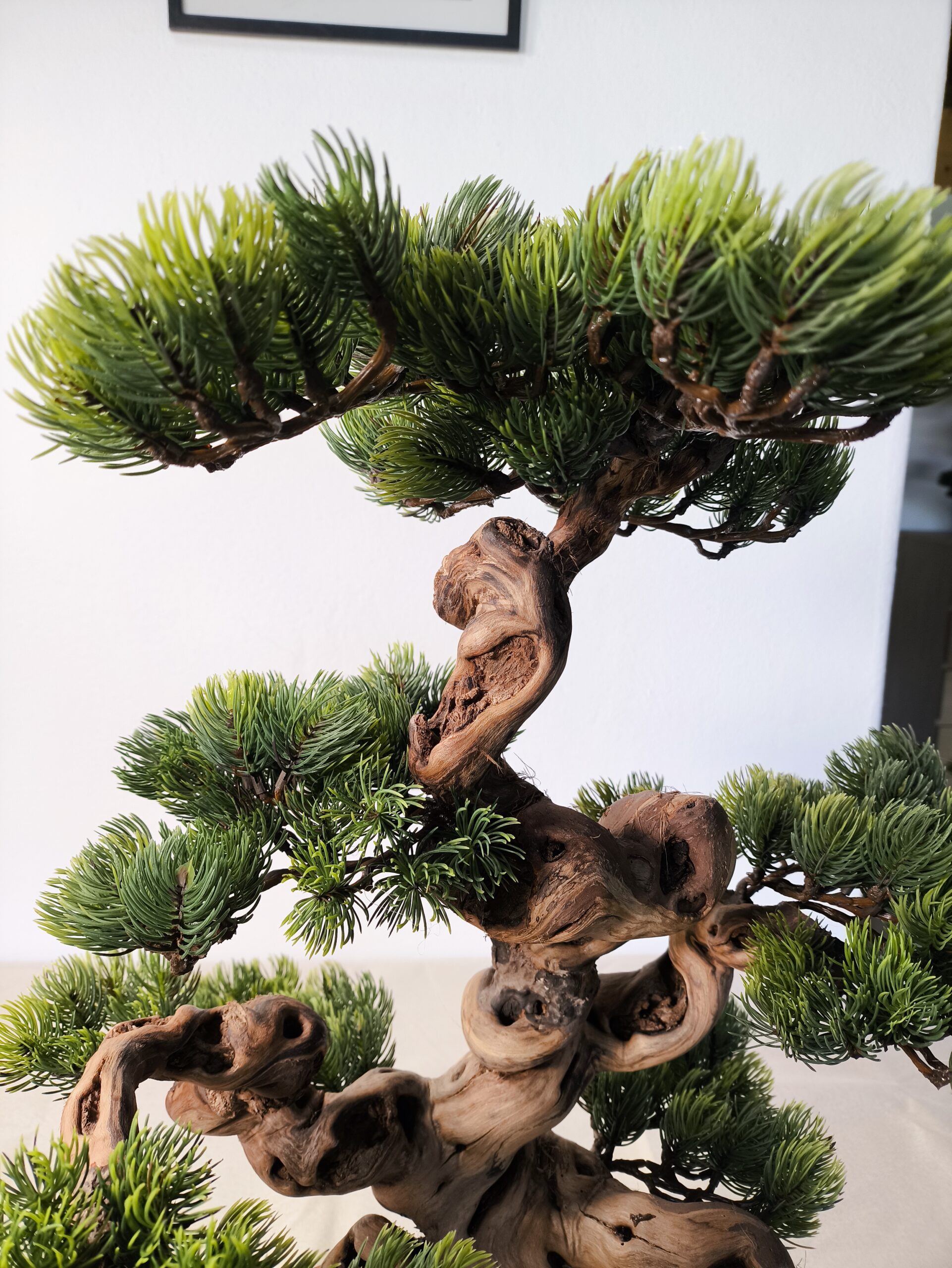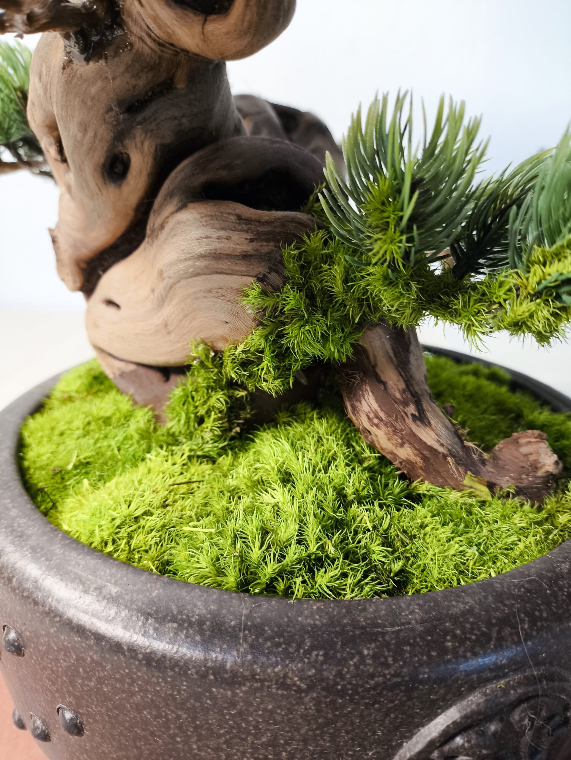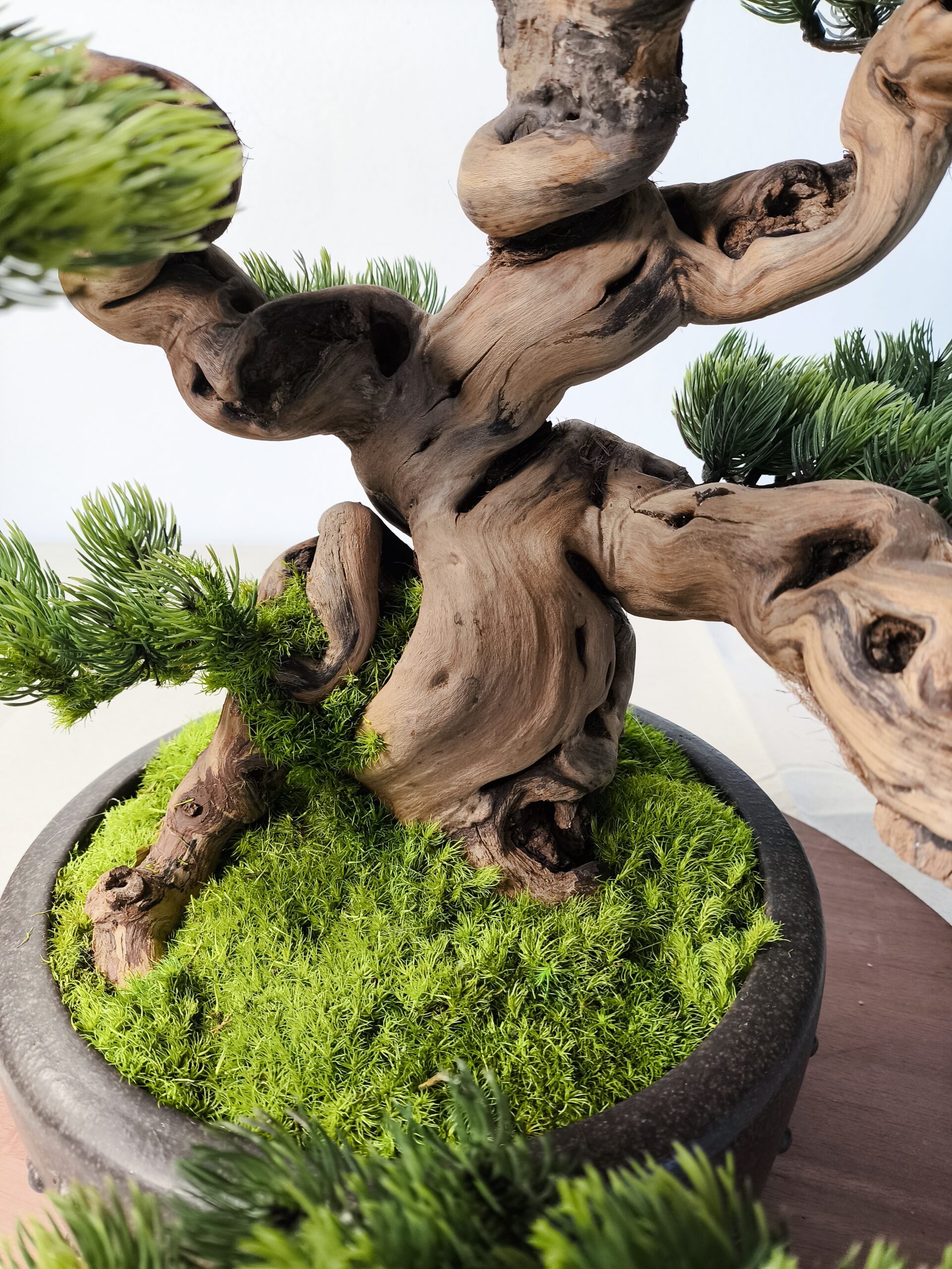 Dieser Semi-Artificial Bonsai zeichnet sich durch eine außergewöhnlich kraftvolle Basis und eine stark bewegte, organische Linienführung aus. Der Stamm aus echtem Holz wurde gezielt ausgewählt und handüberarbeitet, wodurch eine markante, lebendige Struktur entsteht, die an gewachsene Naturformen erinnert.
