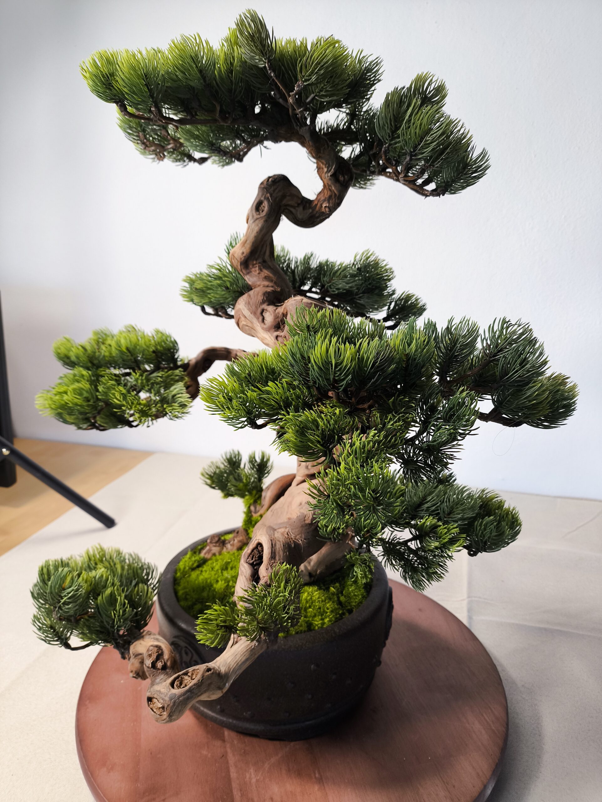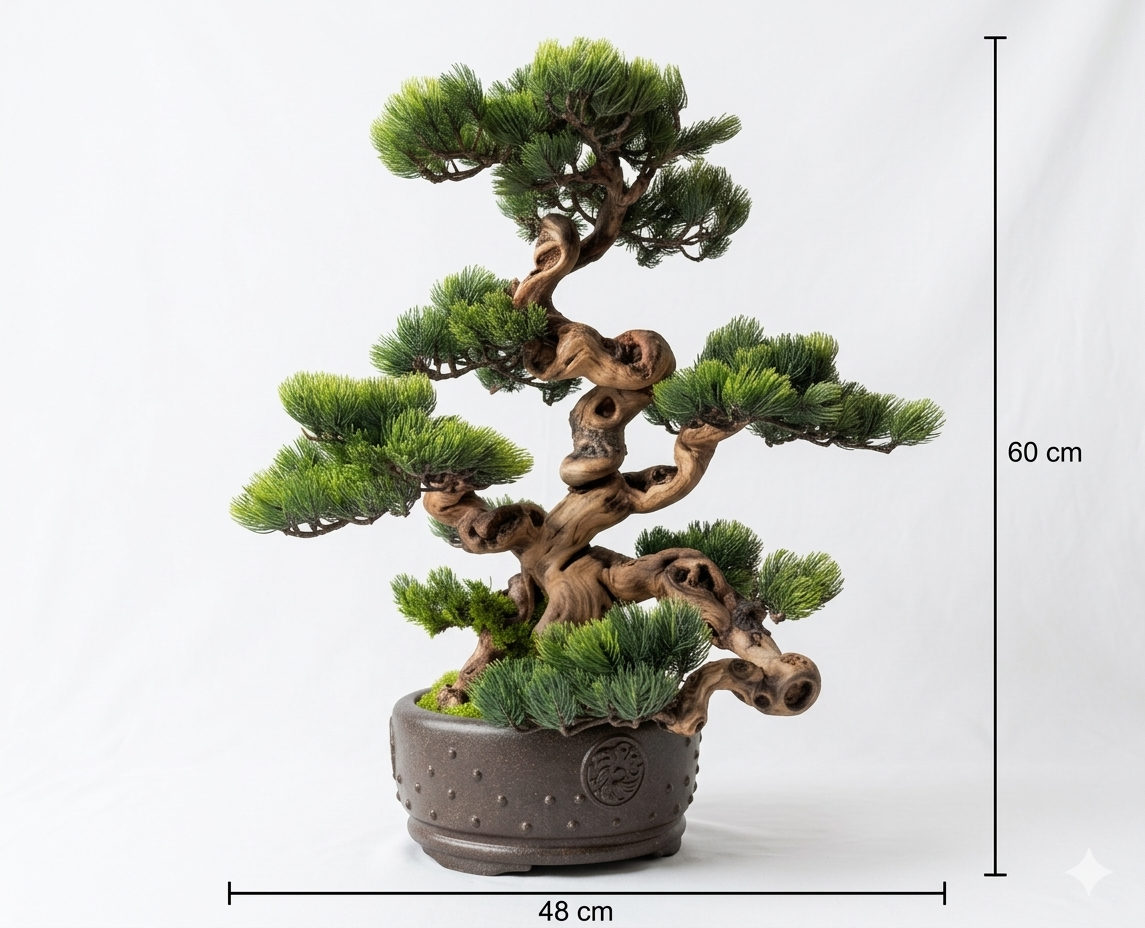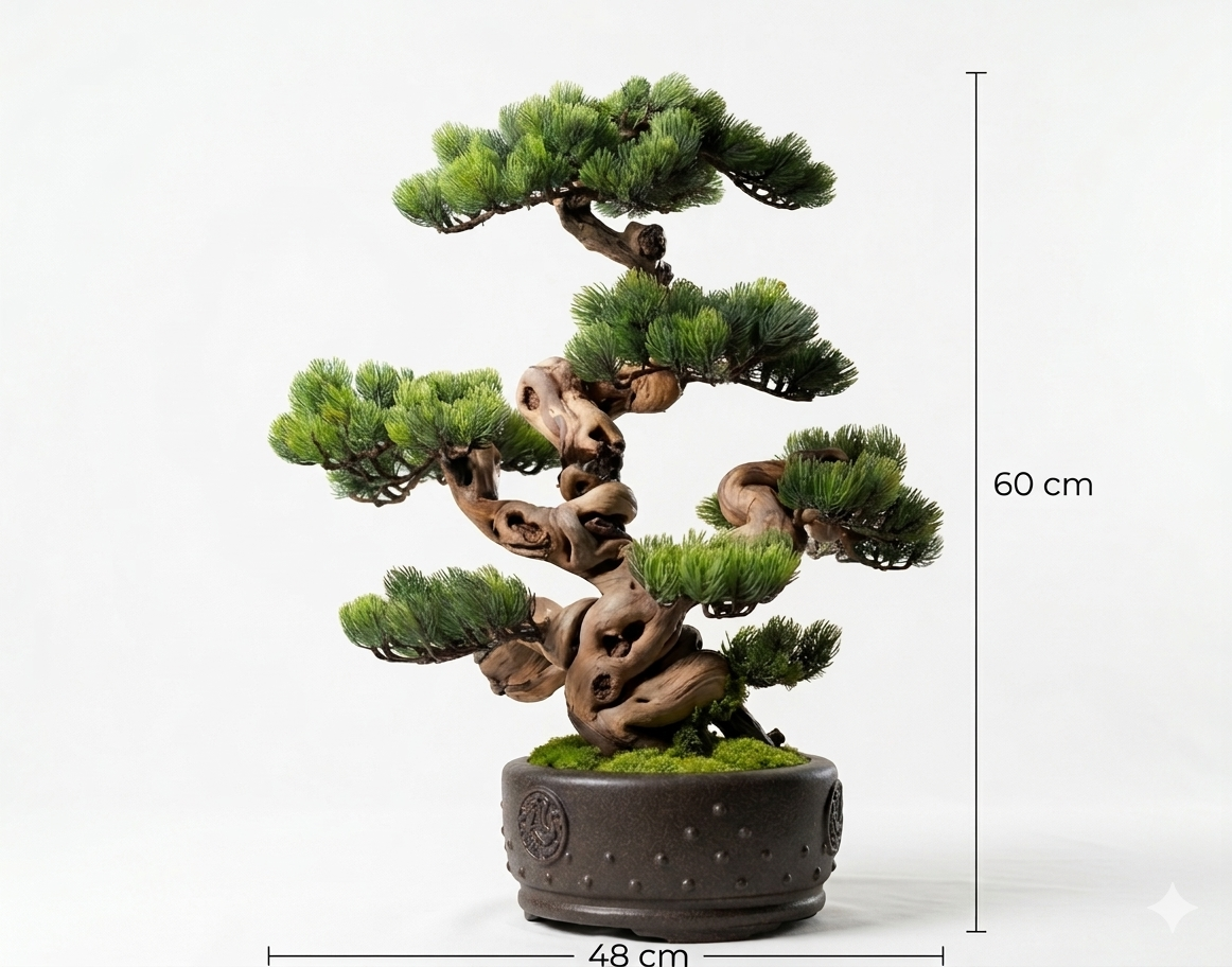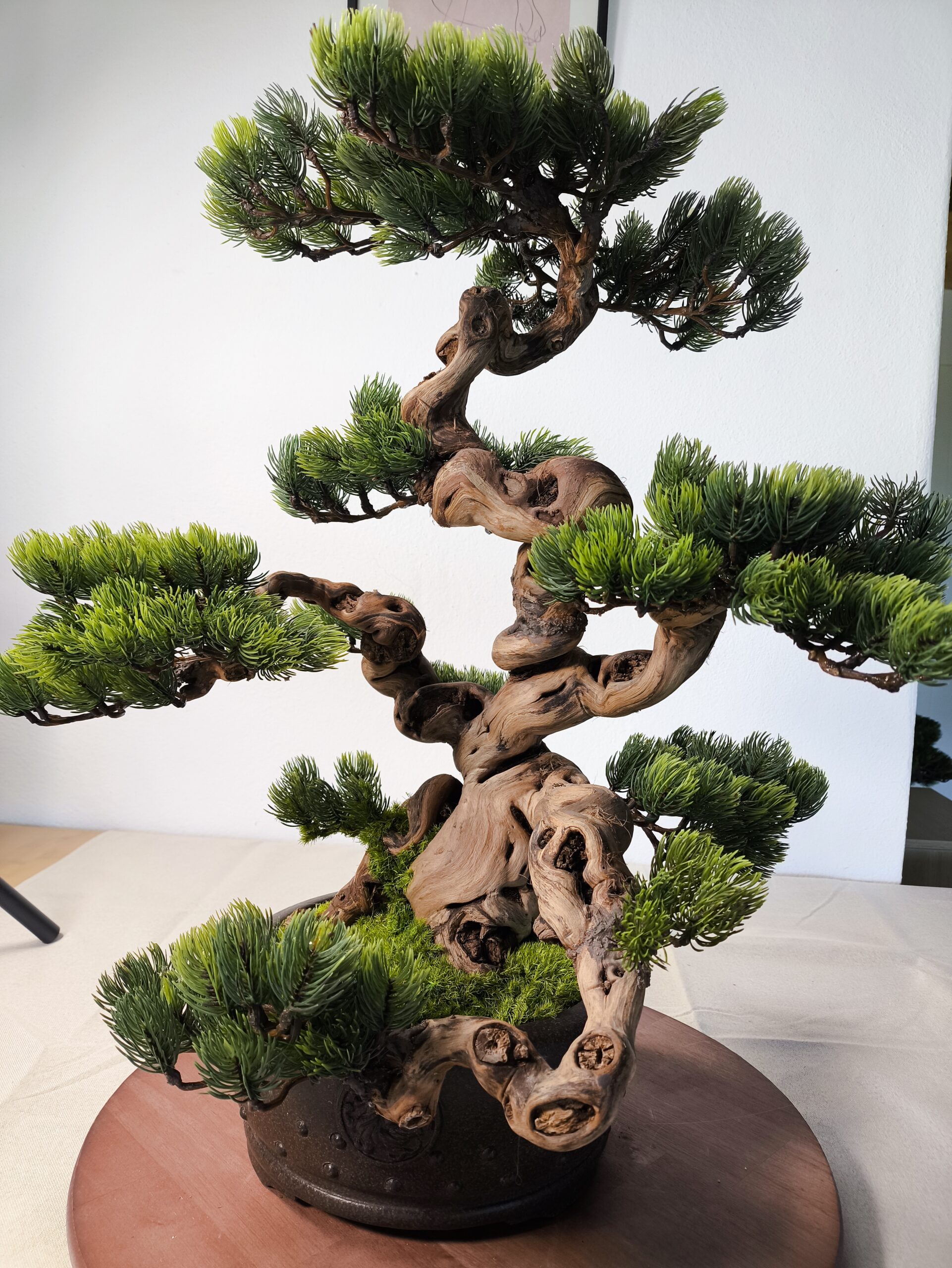 Dieser Semi-Artificial Bonsai zeichnet sich durch eine außergewöhnlich kraftvolle Basis und eine stark bewegte, organische Linienführung aus. Der Stamm aus echtem Holz wurde gezielt ausgewählt und handüberarbeitet, wodurch eine markante, lebendige Struktur entsteht, die an gewachsene Naturformen erinnert.