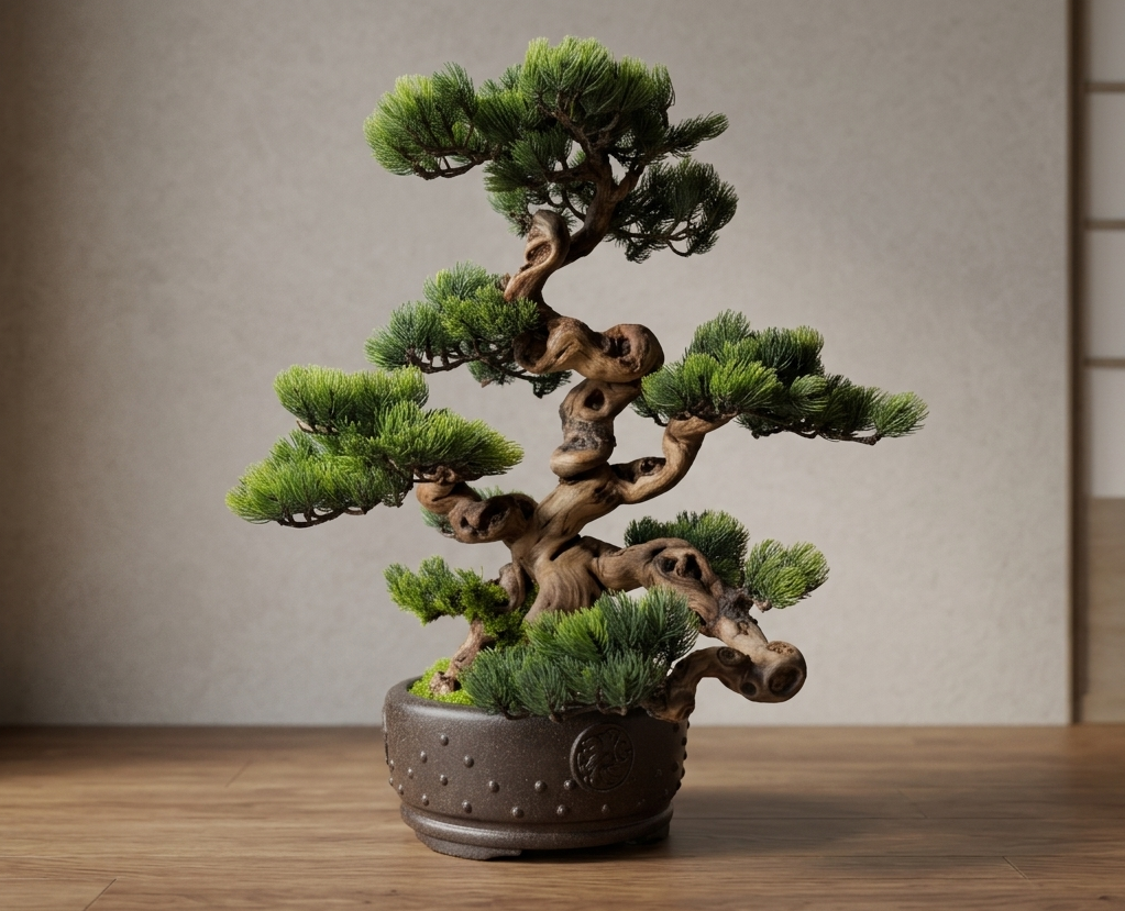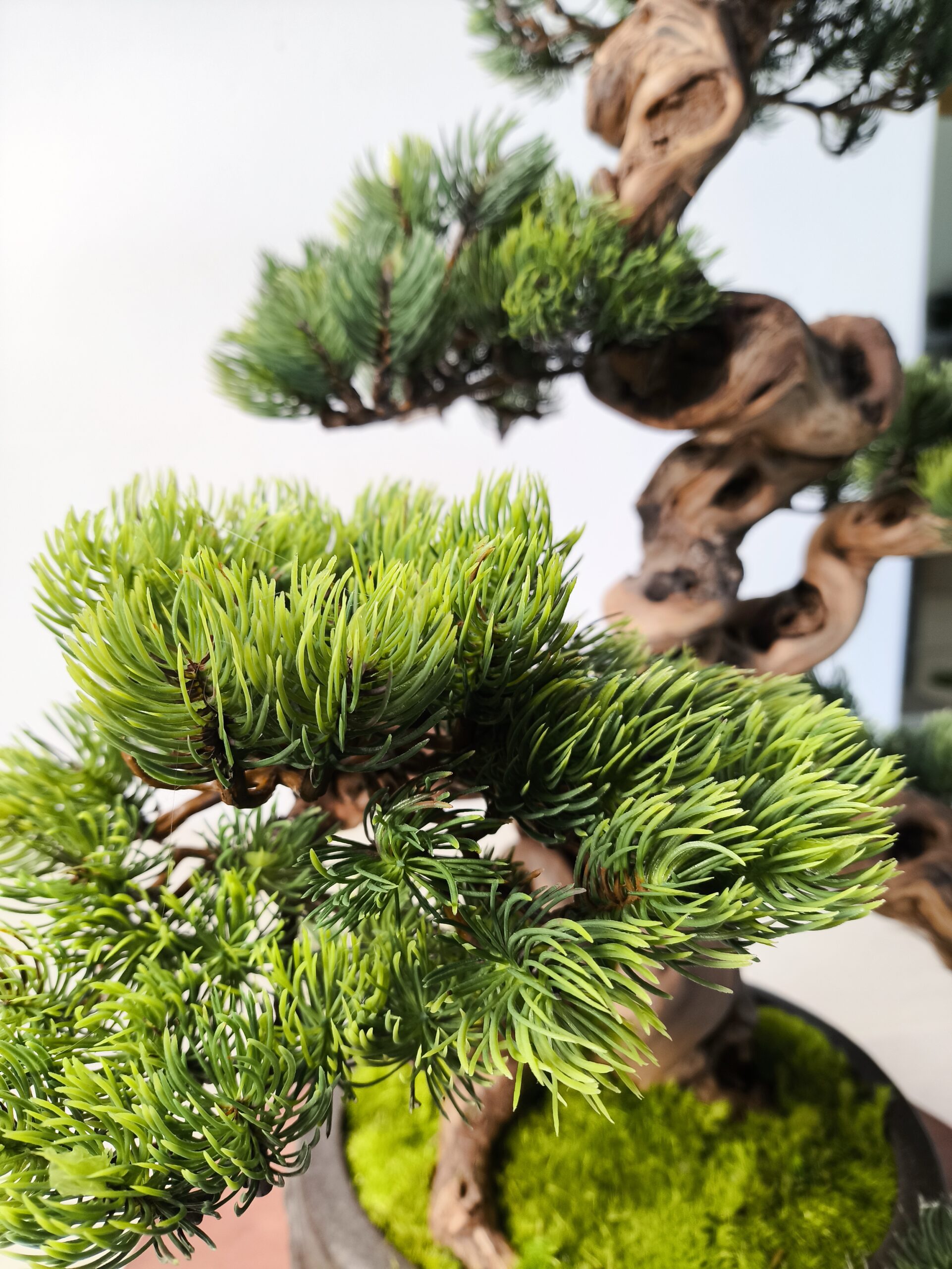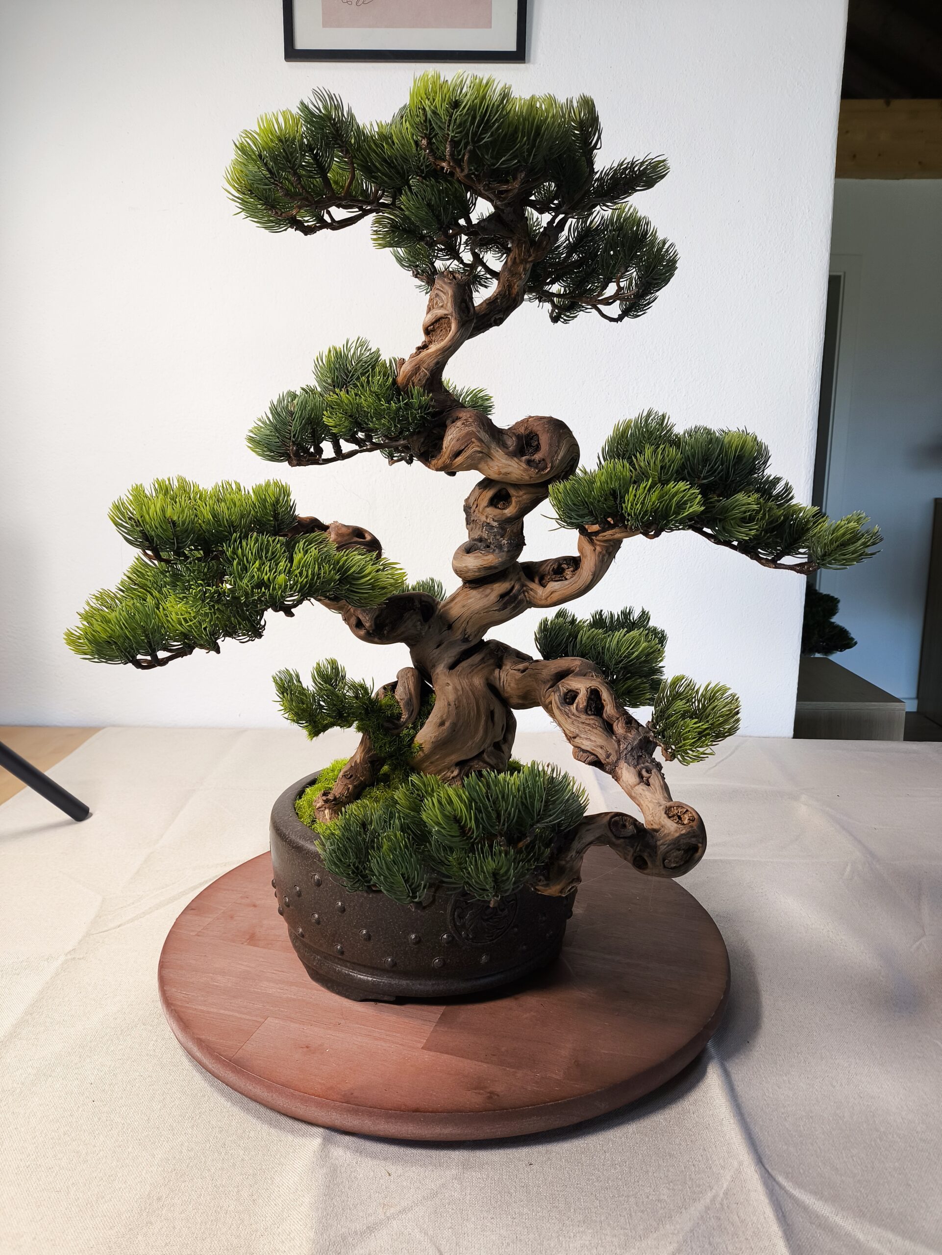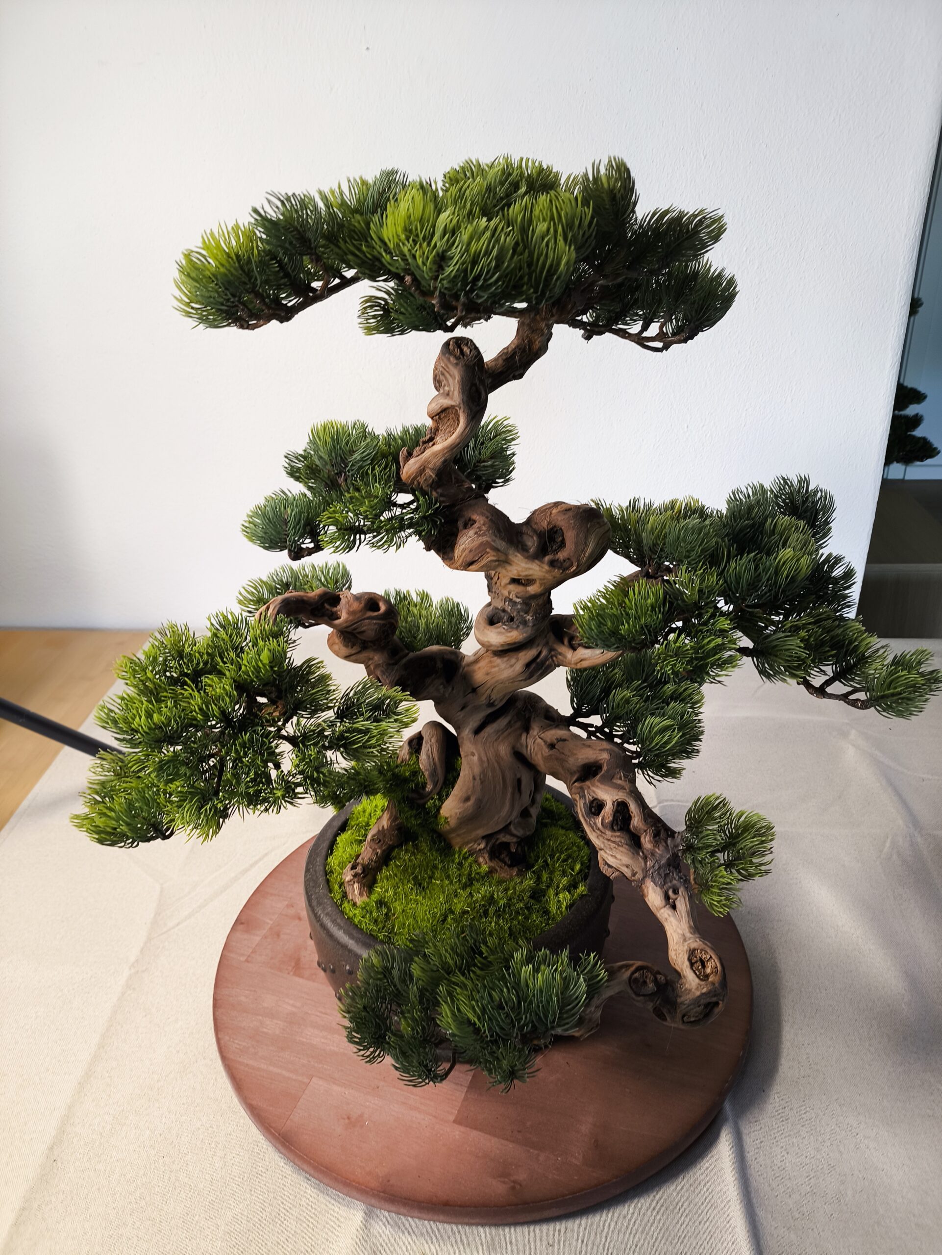Dieser Semi-Artificial Bonsai zeichnet sich durch eine außergewöhnlich kraftvolle Basis und eine stark bewegte, organische Linienführung aus. Der Stamm aus echtem Holz wurde gezielt ausgewählt und handüberarbeitet, wodurch eine markante, lebendige Struktur entsteht, die an gewachsene Naturformen erinnert.