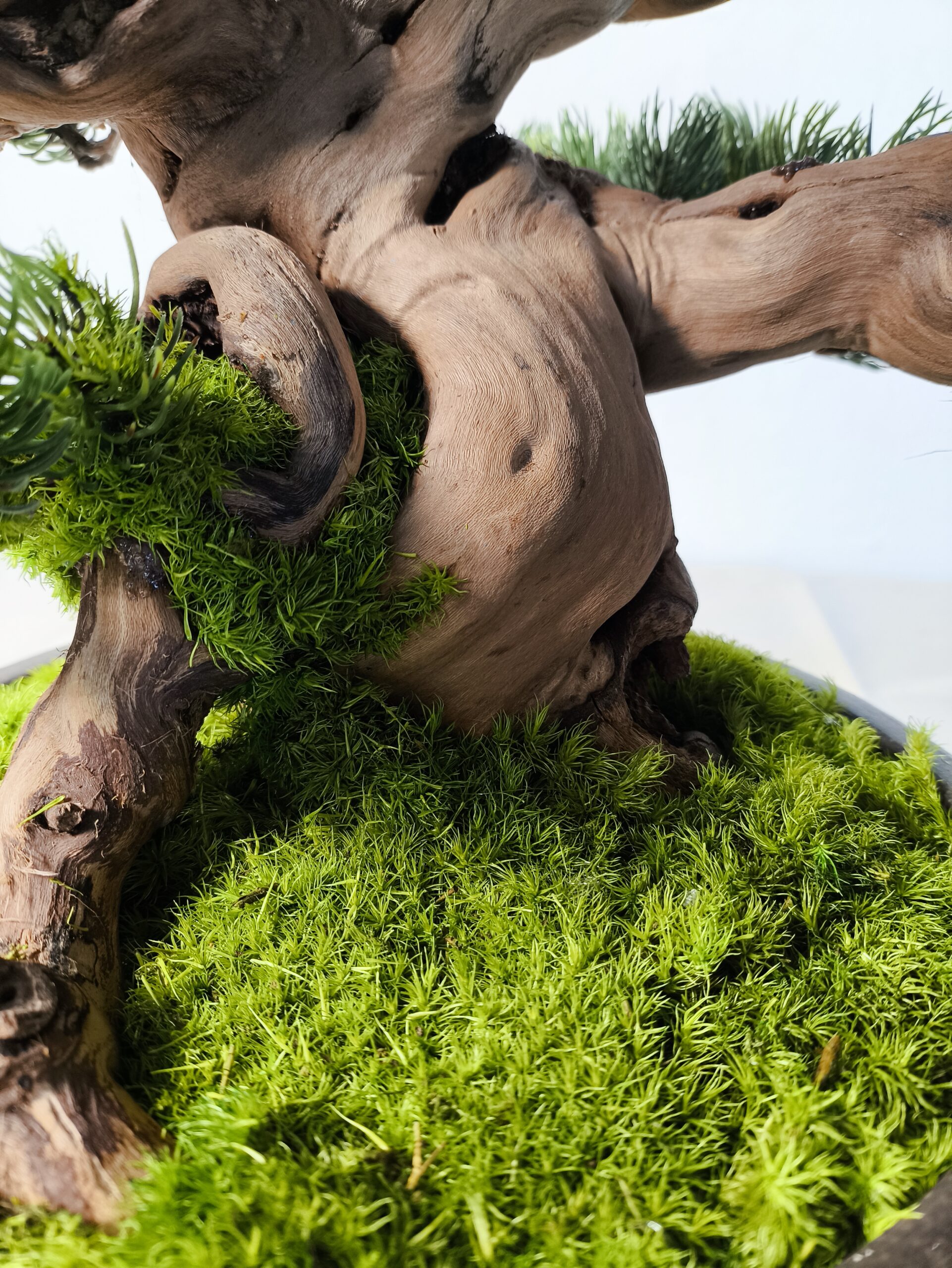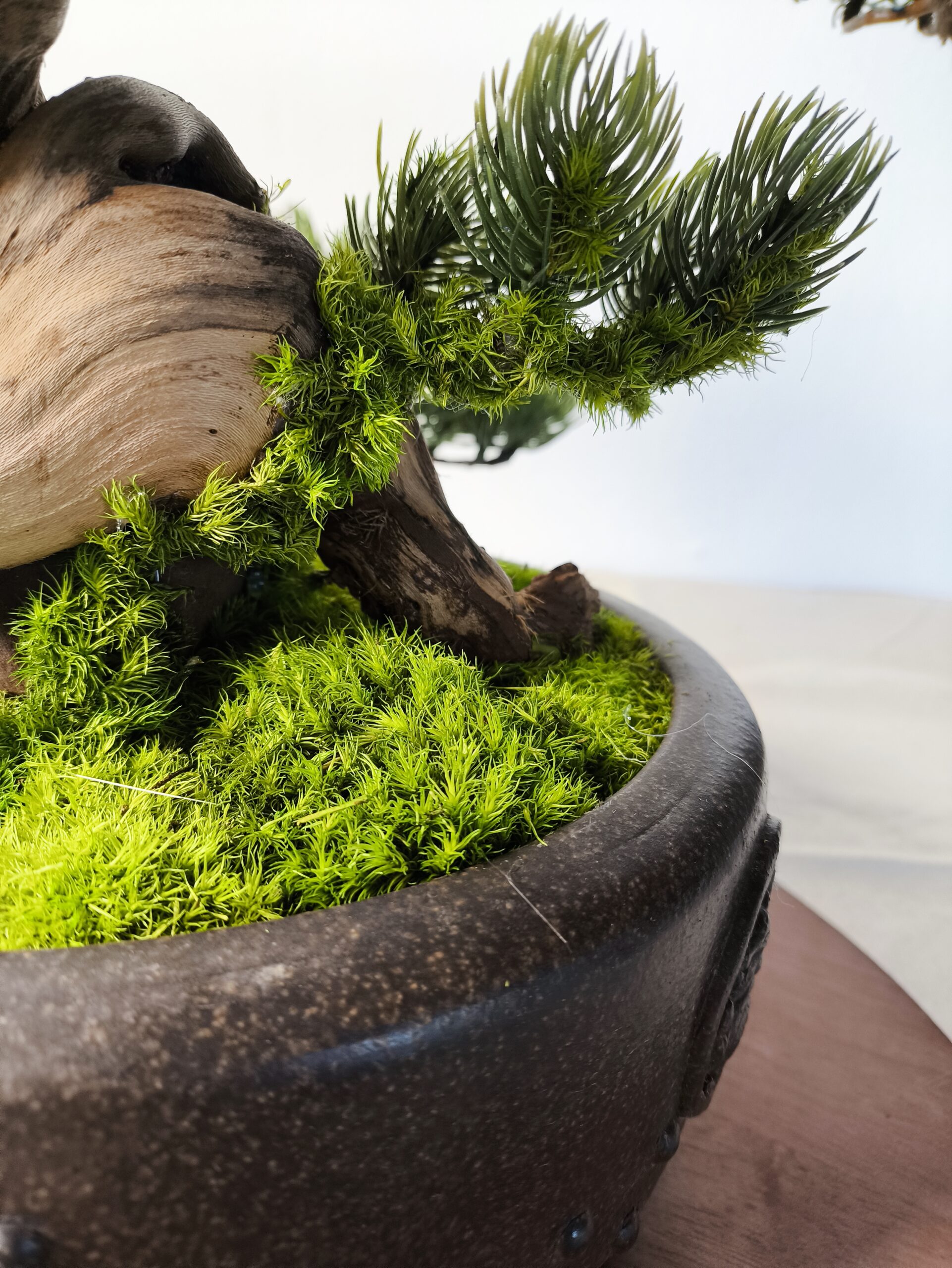 Die fein ausgearbeiteten Nadelpads wirken dicht und lebendig, ohne künstlich zu erscheinen. In Kombination mit dem dezent eingesetzten Naturmoos ergibt sich eine ruhige, geerdete Basis, die das Gesamtbild trägt.