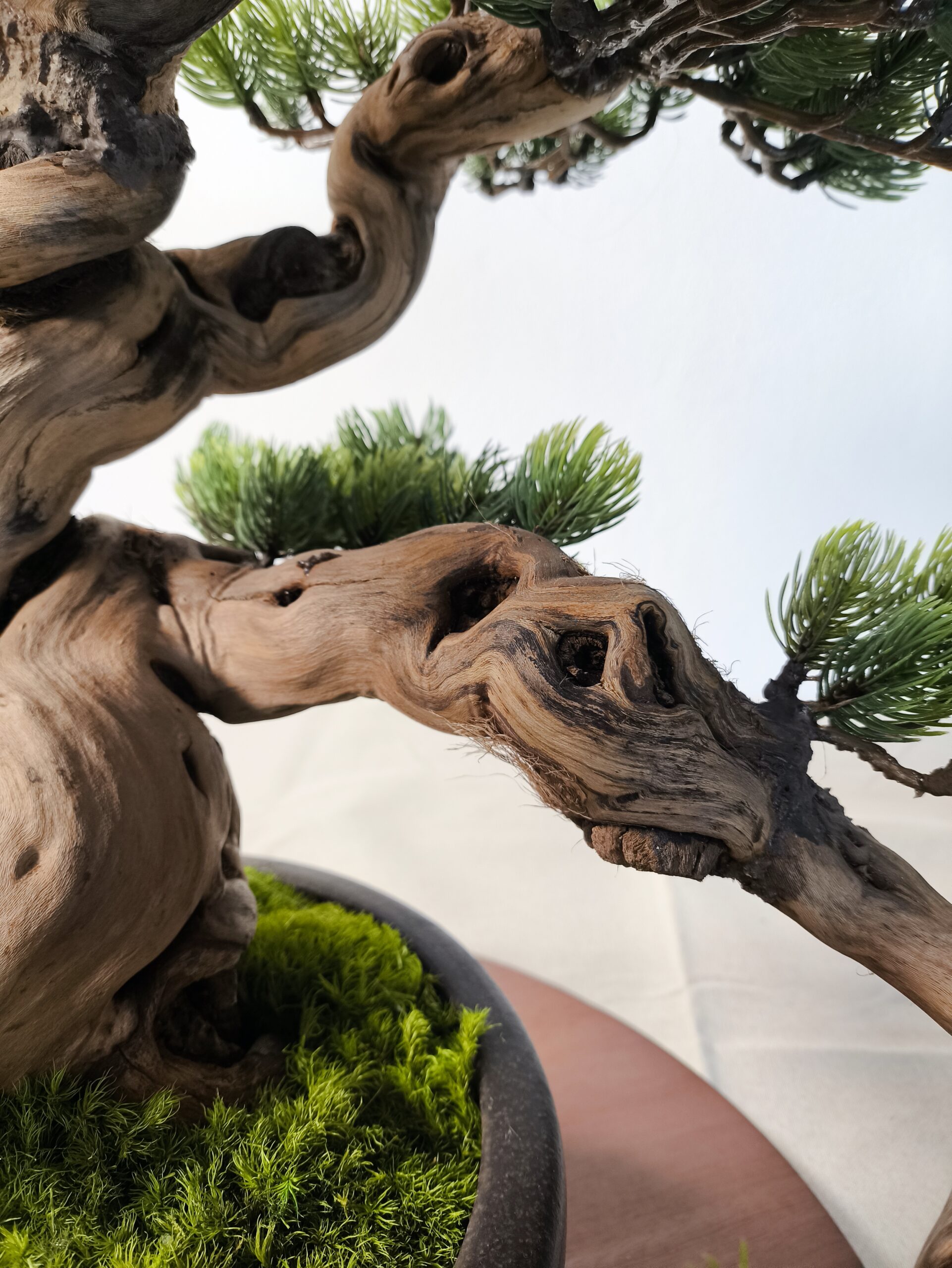 Besonders prägend ist das ausgeprägte Nebari, das dem Objekt visuelle Stabilität und eine außergewöhnliche Präsenz verleiht. Der Stamm entwickelt sich daraus in einer kunstvoll geschwungenen Bewegung nach oben und erzeugt eine dynamische, zugleich ruhige Gesamtwirkung.