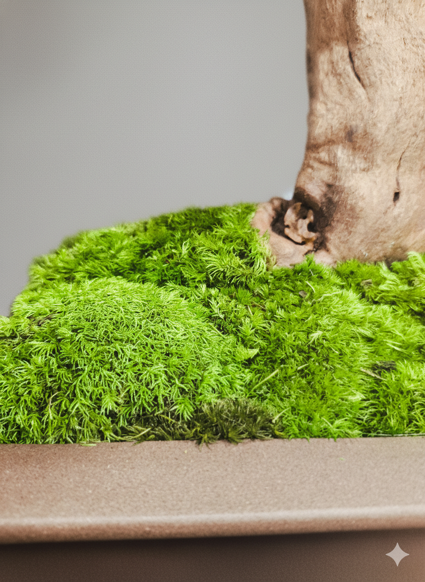 Das konservierte Moos fasst die Basis wie eine kleine Landschaft und beruhigt das Gesamtbild.