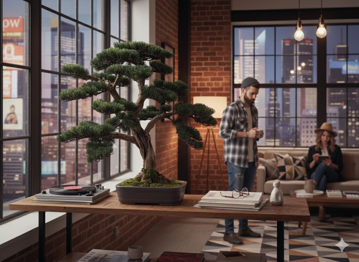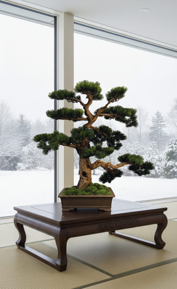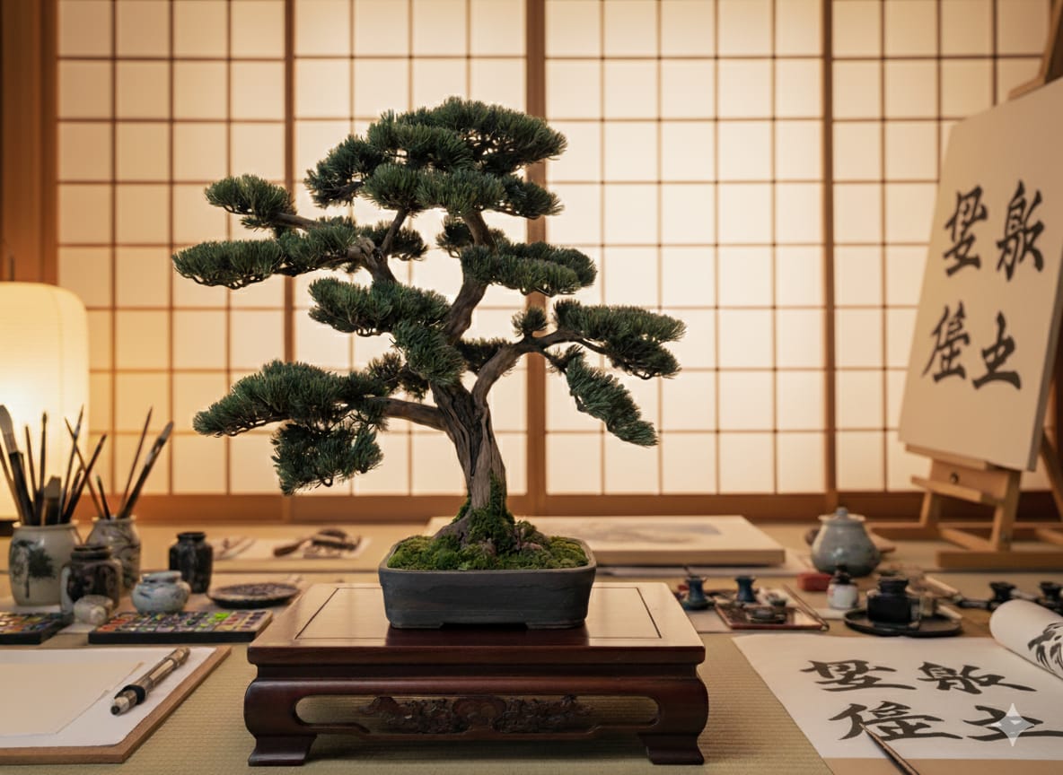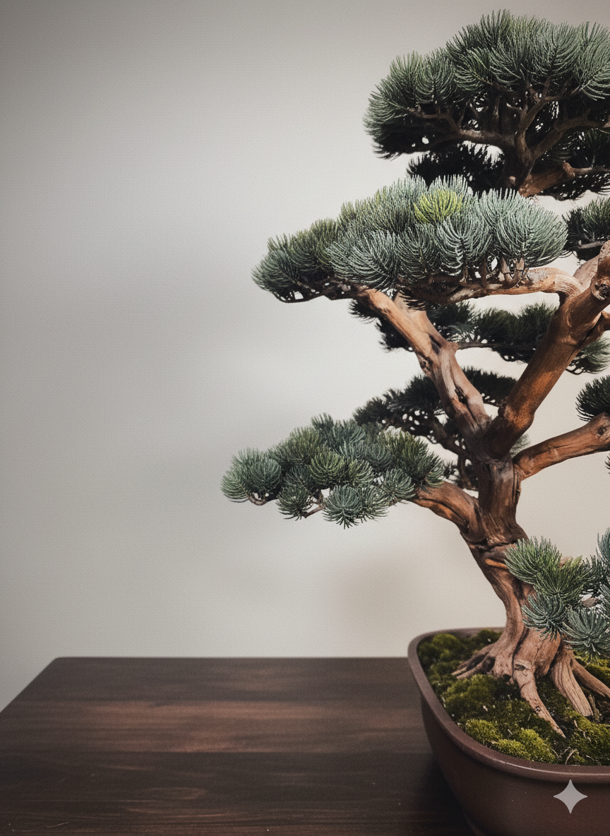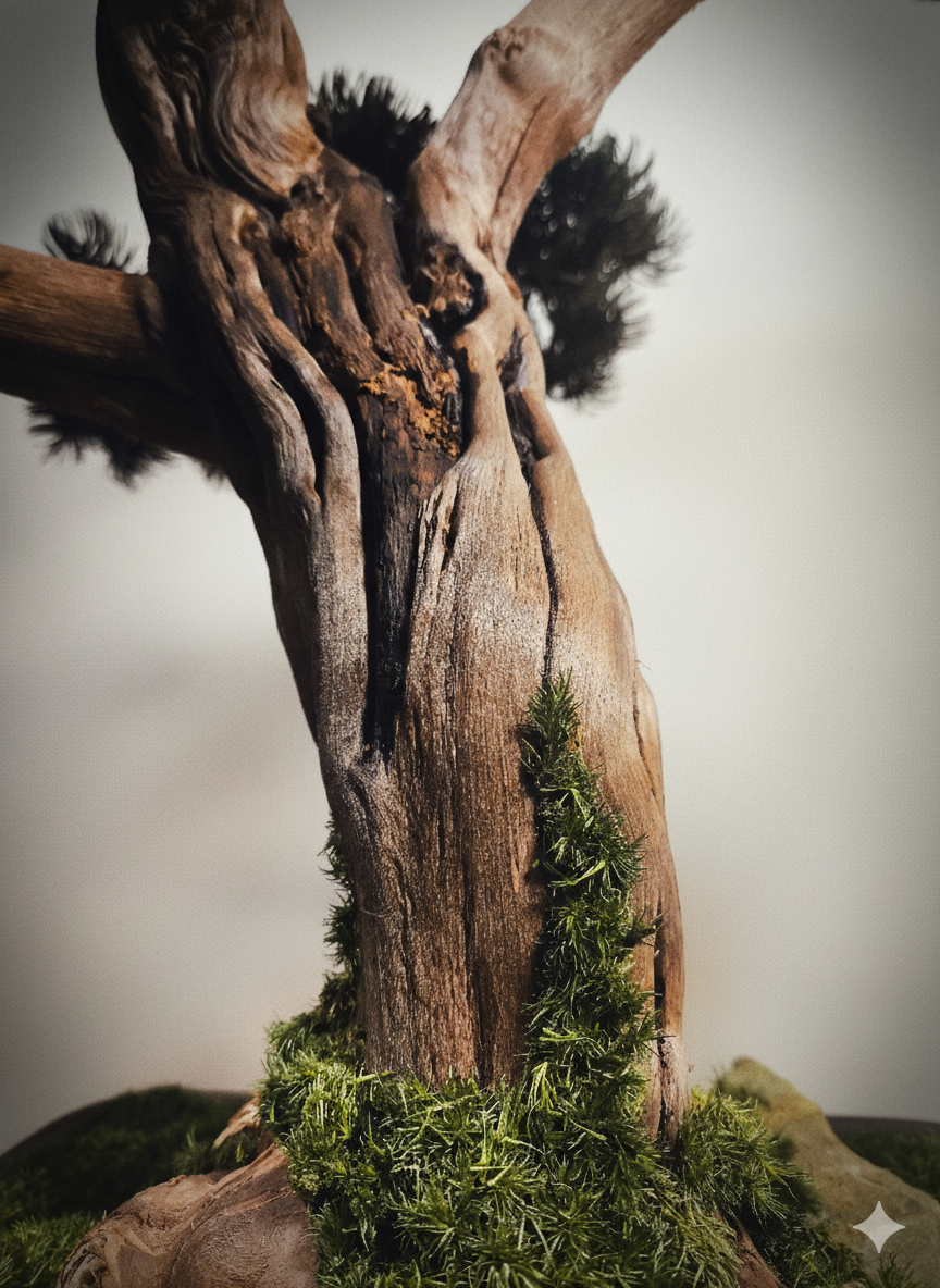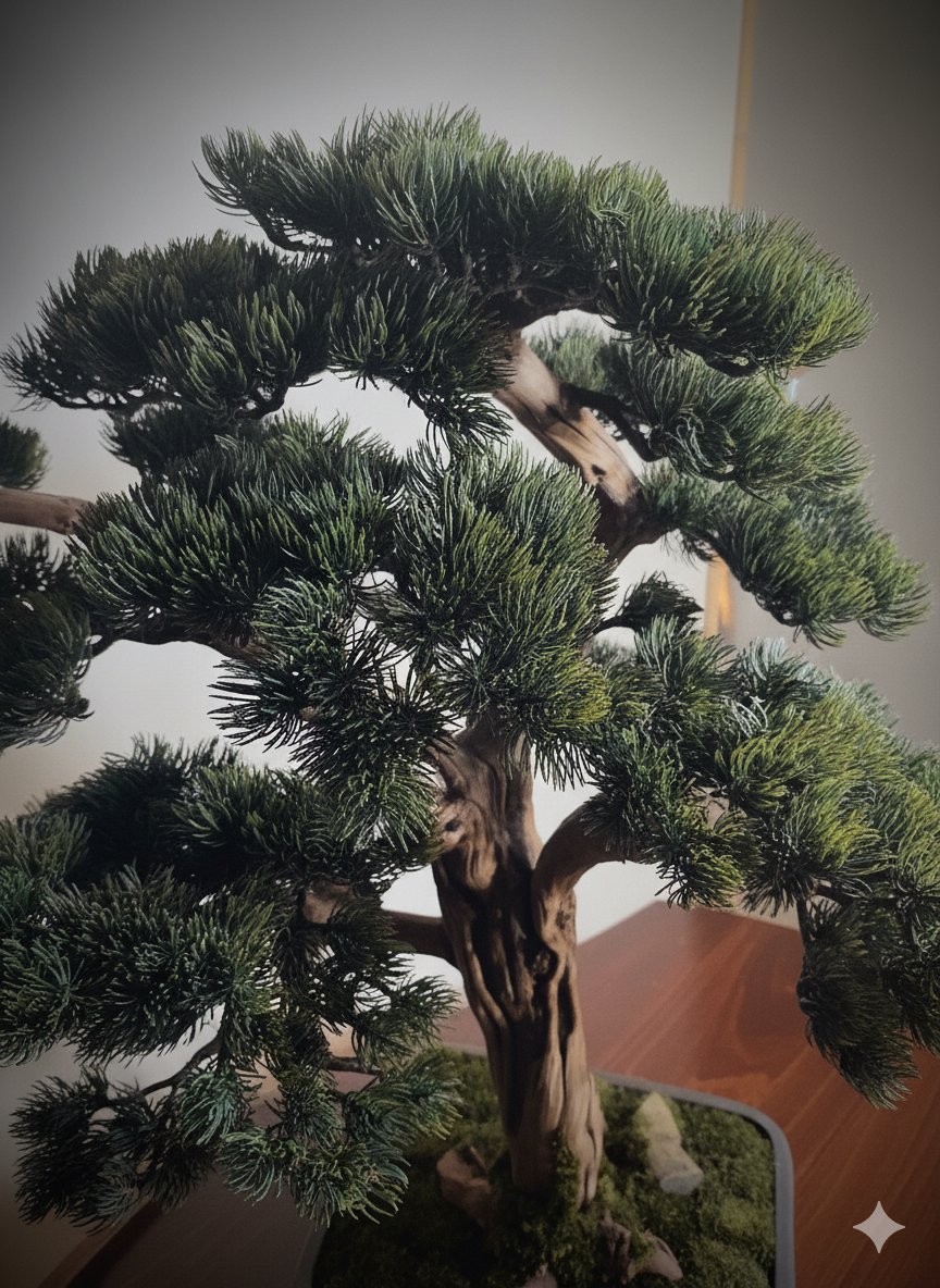 Dieser Design-Bonsai steht exemplarisch für die Kunst der Balance zwischen Klarheit und Ausdruck.