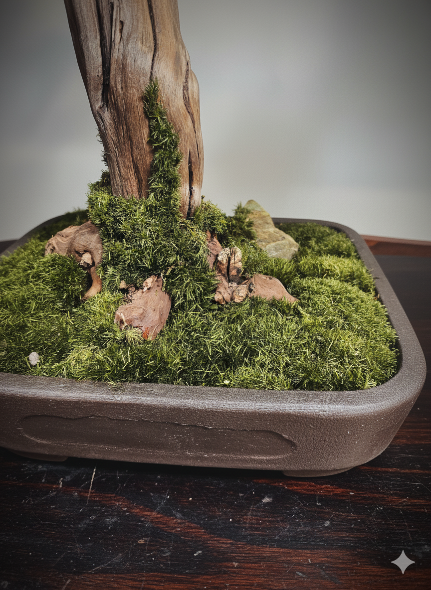 In seinem Aufbau folgt der Bonsai klassischen japanischen Kompositionsprinzipien, interpretiert sie jedoch mit einer zeitgenössischen Gelassenheit.
